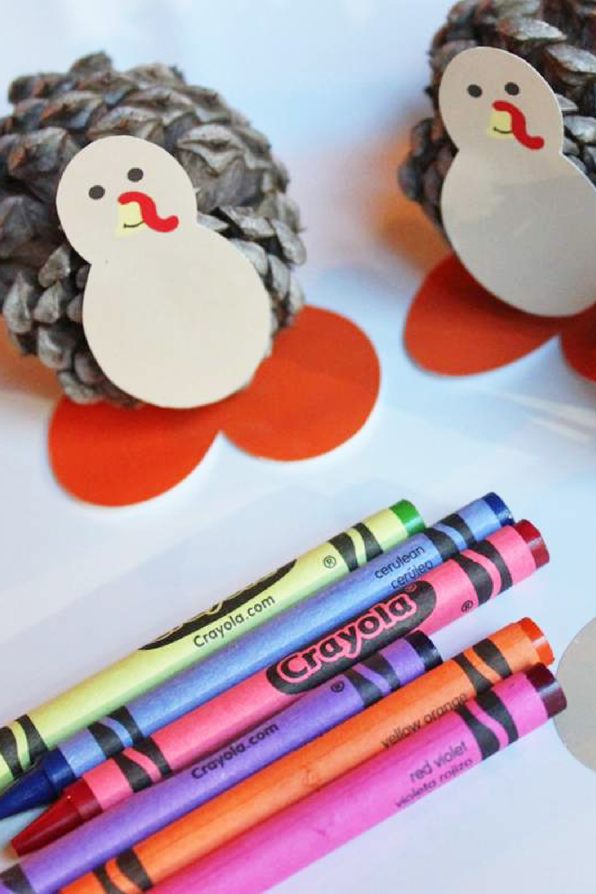 Grab some pinecones, colorful feathers, googly eyes, and construction paper. Stick the feathers on for the turkey tail, add googly eyes, and glue on a construction paper beak and wattle.