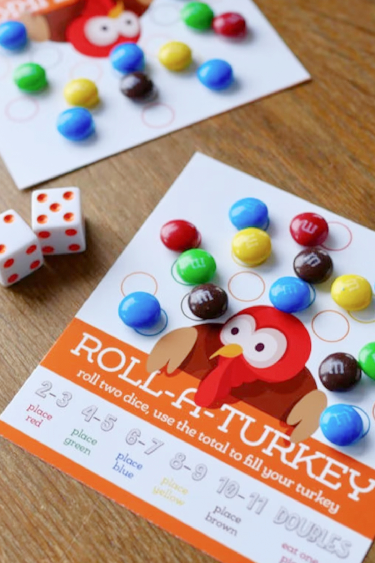 Print out these turkey cards and have a bowl of colorful chocolate candy at hand. Roll the dice and add up the numbers. Check the color code on the bottom of the sheet and use it to place the candy.