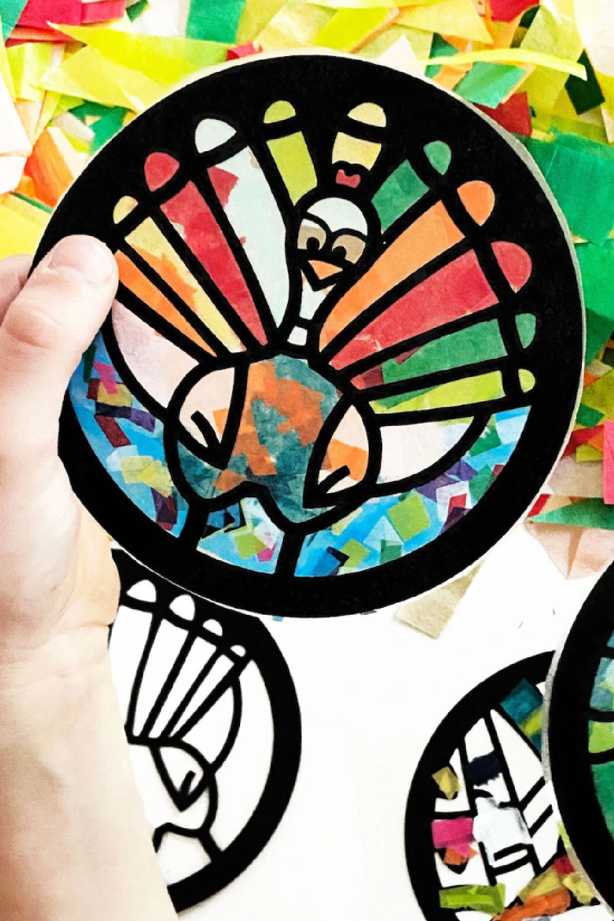 This suncatcher craft is a fantastic way for kids to get creative while making a colorful Thanksgiving decoration.