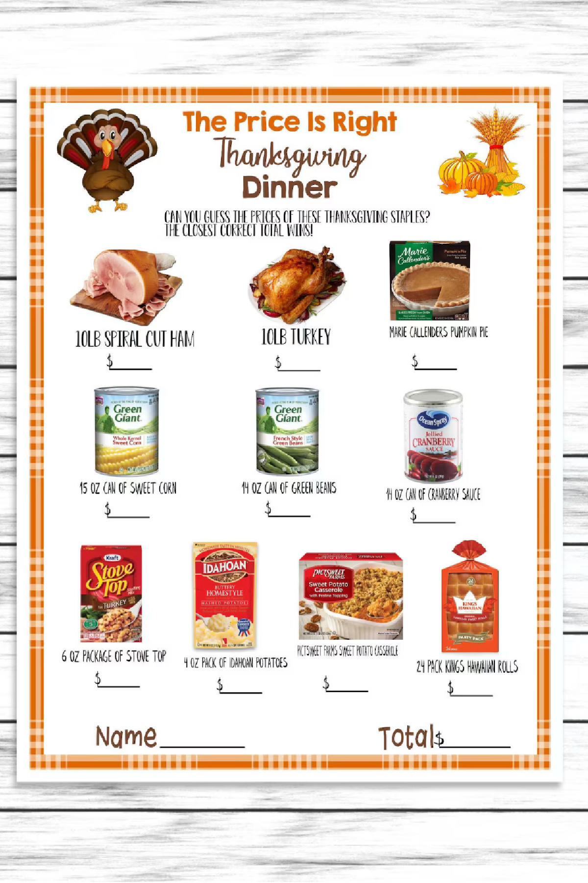 This Thanksgiving version of The Price is Right adds a fun twist to the holiday by challenging guests to guess the cost of classic Thanksgiving dinner items.