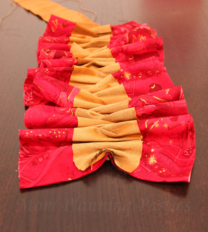 5) Scrunch and finish. Gently push your fabric down the thread line until you get your desired ruffle effect. Now you can go back and tie off your thread at the end of the ruffle.